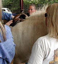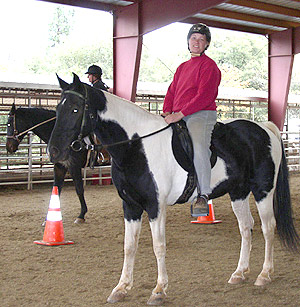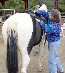 With no rider in the saddle you should be able to fit three fingers into the gullet space between the bottom of the pommel and the horse's withers without feeling cramped. As long as the tree angle fits, if there isn't sufficient room, a saddle fitter may be able to add flocking to an English saddle or shims to a Western saddle to ensure that the saddle clears the horse's withers. With a rider in the saddle, there needs to be at least two fingers (2”) of space to assure that the tree is not able to put pressure directly on the horse’s spine. Look down the gullet—the part that sits above the tree or panels—from the front and from the rear, if you can. The gullet should clear the entire length of the horse's spine by 2” - 3”. Element 7: Stability With no pad, cinch up the saddle and check for excessive movement side to side. Look at the saddle from all angles to make sure the gullet lines up with the topline of the horse. Horses may be asymmetrical and so might a saddle. Closely check to make sure any unevenness is not causing an issue with this horse-saddle combination. Element 8: Correct Saddle Length The weight-bearing surface of a saddle should be from 2" behind the shoulder blades to the point where the last rib meets the spine. To find this point (known as T18), locate the last rib and follow it up to the spine. If the saddle sits behind this point, it will rest on the lumbar region--the weakest part of a horse's back--where it can cause injury. Element 9: Horse's Response Every horse is inherently honest. No horse ever lies about saddle fit, so listen to him. He will tell you whether he is comfortable by his movements and actions. This is the acid test of saddle fitting. A horse that moves freely, calmly, without hesitation or rushing is probably wearing a saddle that fits him correctly. Most horses show an immediate, dramatic change in disposition and movement when an ill-fitting saddle is fixed or replaced with one that fits well. (Click here for more signs of an ill fitting saddle) When a horse just isn't going "right", the saddle (the back), the feet and the teeth are the most important places to look for clues to answer why. Your veterinarian, your farrier and your saddle fitter will be your best allies in helping you determine what is creating problems in your horse. Element 10: Elements 1-9 While Riding This is the final test once you have a saddle that you think fits. Saddle up with a thin pad and check how all of the above elements fare with a rider’s weight and while the horse is moving.